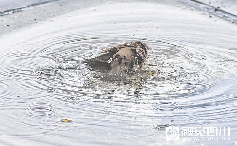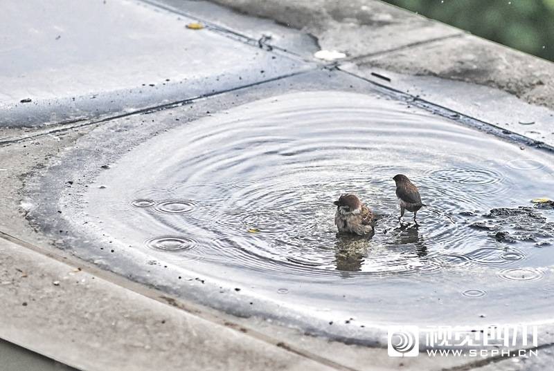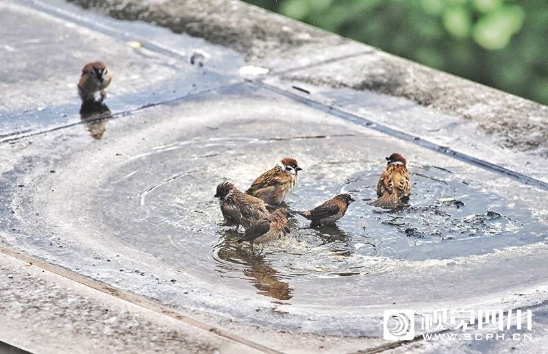 成都的留鸟有很多,常见的不外乎就是麻雀、白头翁(白头鹎 bei)、斑鸠一类。10月2日午间,绵绵细雨让初秋的蓉城凉意不少,窗外夜雨留在屋棚上积下了少许积水,不意间成了这些留鸟的天然“澡堂”。麻雀们结队在这里舒展羽翅,体大的白头翁跳跃着想独霸享受,小蜡嘴乘机和麻雀群体攻之,鸟儿们在城市中自由的生存状态已很常见,据了解,成都野生鸟类种类占全国鸟类资源三成以上,观察记录在案的就有四百多种,鸟类专家也提醒,在户外尽量不要去触碰这些野生鸟儿。