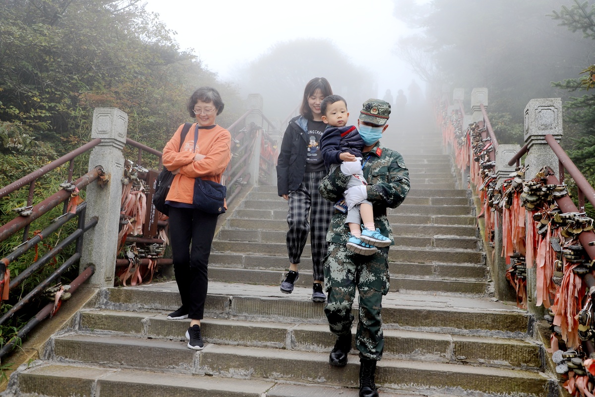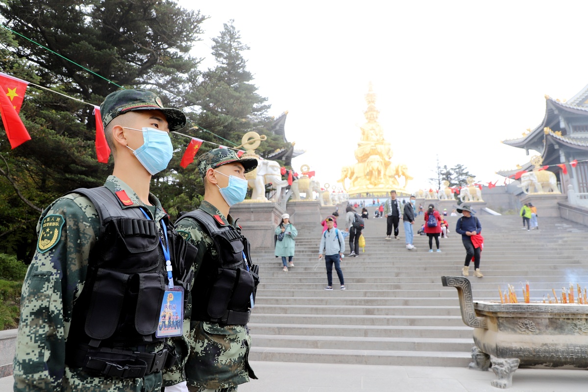 国庆中秋“双节”长假,广大群众争相到各大景点拍照打卡。10月3日,峨眉山景区迎来了客流小高峰,武警四川省总队乐山支队派出官兵,积极配合峨眉山景区管委会担负景区入口、金顶片区等重要景点的执勤任务。