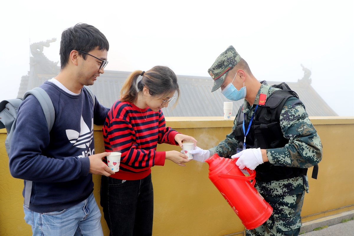 武警官兵成立的巡逻小组在金顶景区开展便民服务,为游客提供热水,帮助游客指引游览路线。国庆期间,他们执勤的身影成了景区里又一道亮丽的风景线。