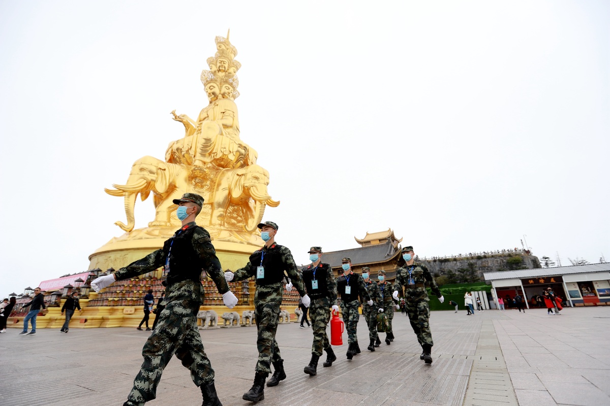 武警乐山支队某中队指导员牟凌彤介绍,支队在合理部署兵力情况下,全力配合景区做好秩序维护的工作。对于游客容易聚集的金顶、雷洞坪片区,我们派出巡逻小组,全时进行秩序维护,对于遇有困难的游客,我们提供一些便民的帮助和服务,确保游客“双节”期间出游安全顺利。