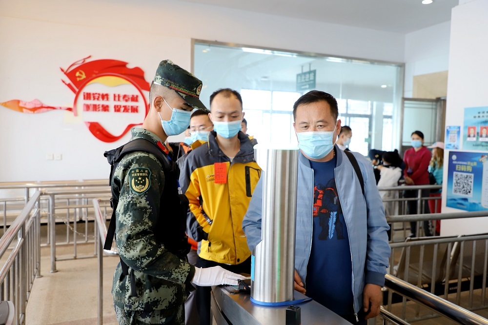 金顶索道入站口是通往金顶景区的必经之路,也是整个景区是人流量最大、人群最密集的地方,武警官兵按照规定佩戴口罩和医用手套等护具,在做好自身防护的情况下,维护现场秩序。