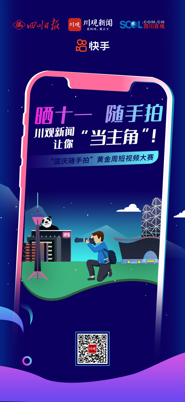 10月1日-8日,川观新闻APP、川报全媒视觉中心将联合快手APP共同发起“国庆随手拍”黄金周短视频大赛。分享心动,就有机会赢取最高2000元的丰厚大奖!