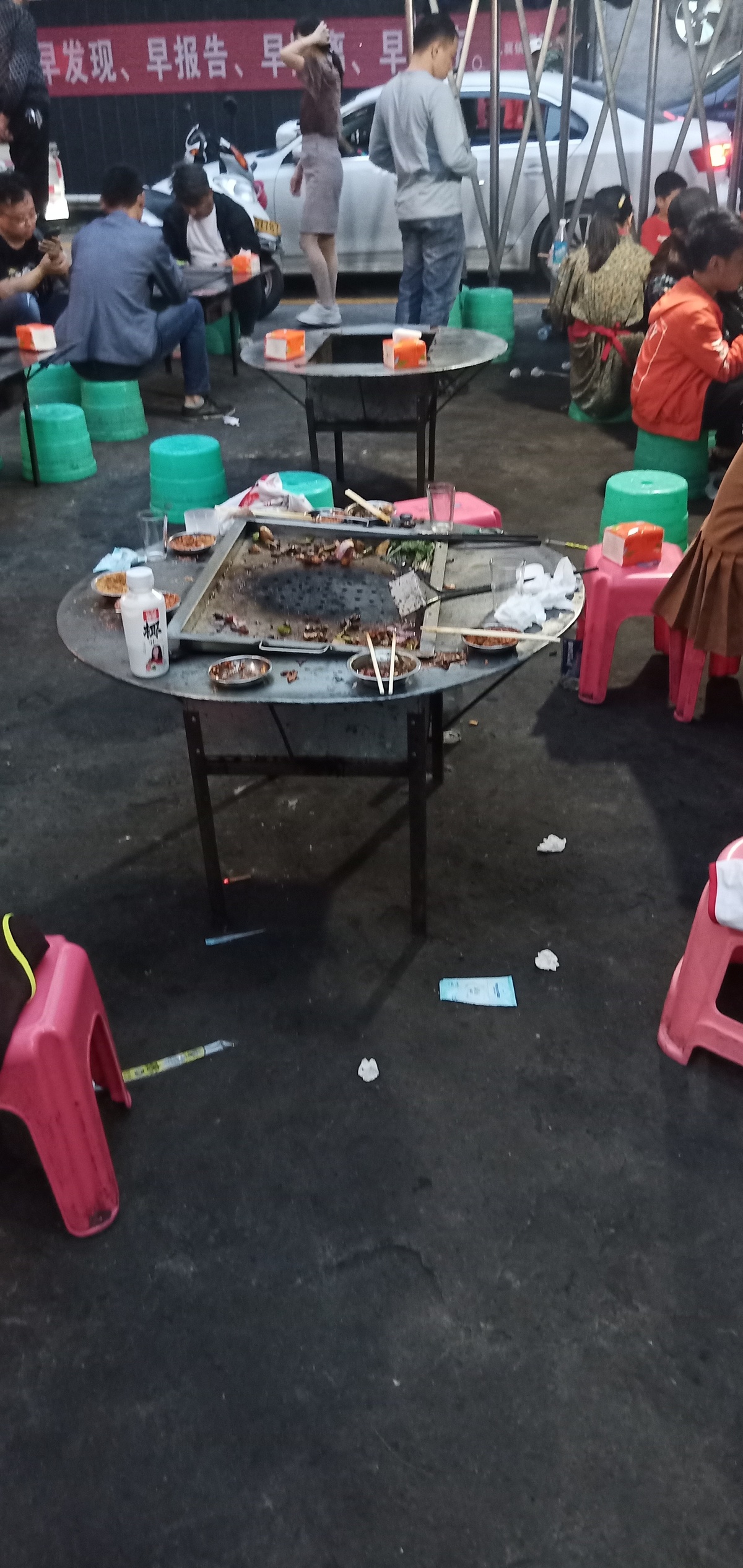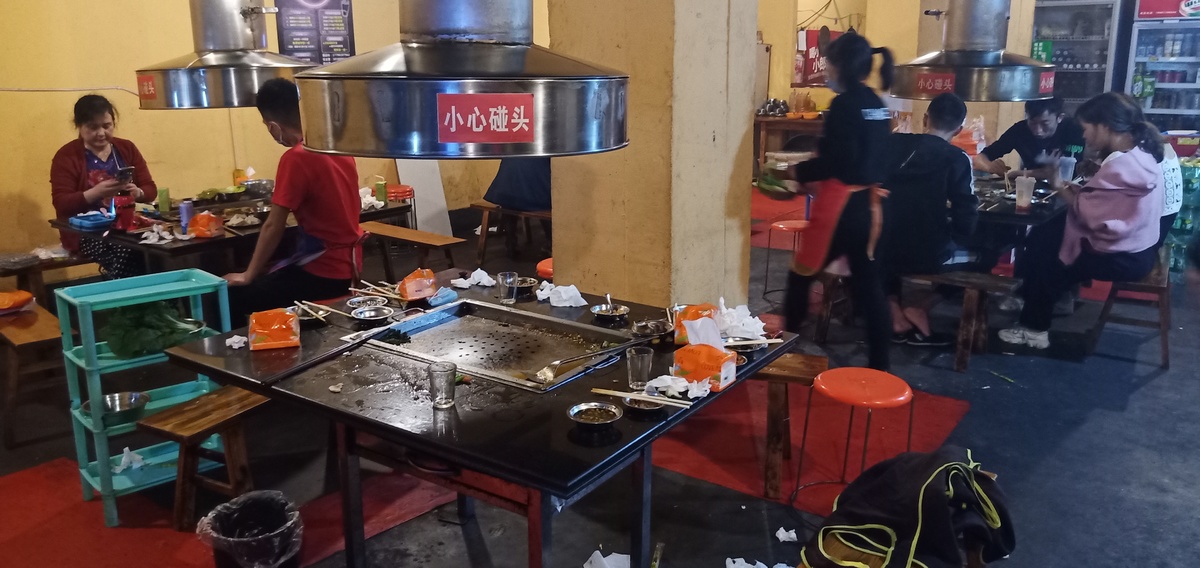 石棉今知烧烤店里,客人离去后留下的餐桌。