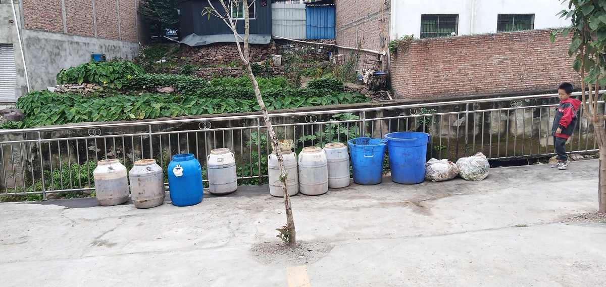 九鼎香餐馆门外的潲水桶还没有装满。