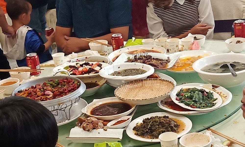 家里亲戚朋友多,四面八方前来祝贺的人坐了六、七十桌。当人们离开的时候,餐盘里多多少少还留了一些菜。