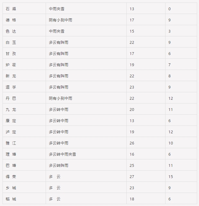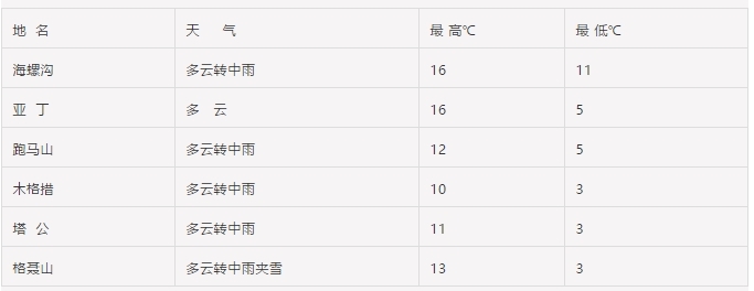未来三天气象预报显示:5日晚到6日白天,甘孜州大部地区有小到中雨(雨夹雪),个别乡镇雨量可达中到大雨,南部地区多云有分散性阵雨。折多山等高海拔地区有雨夹雪。