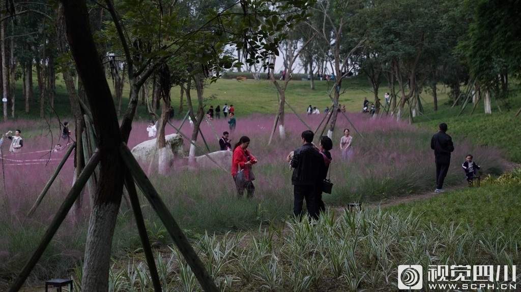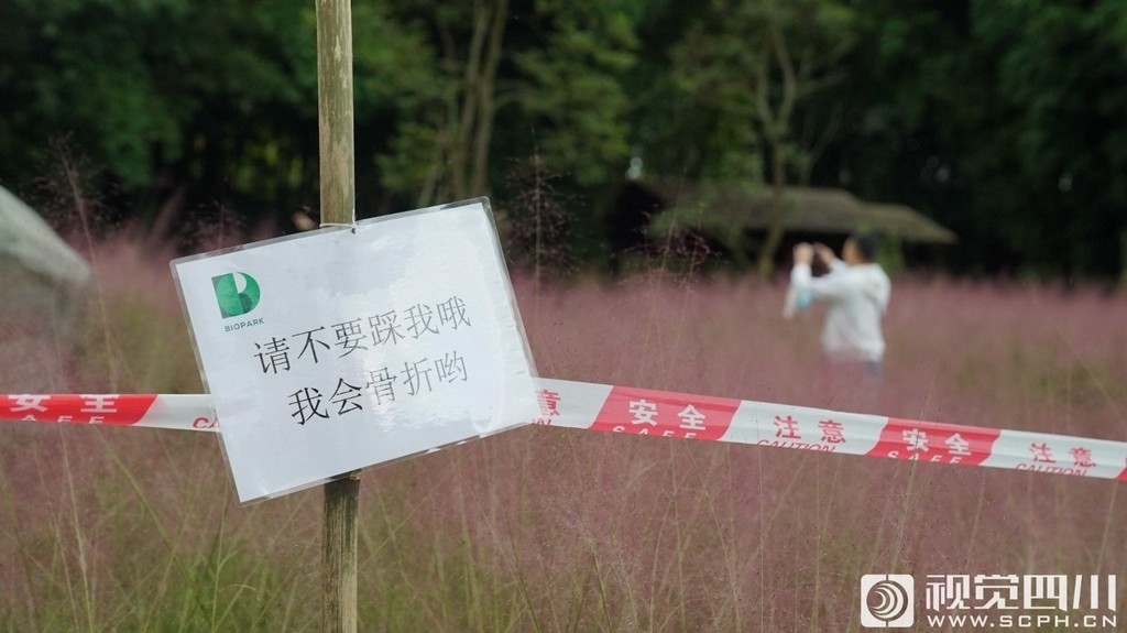 10月7日,记者来到成都永安湖城市森林公园,一片粉黛乱子草形成的靓丽风景线,吸引了众多游客目光,纷纷驻足合影留念。在成片的粉黛乱子草中,专门留出了道路,供游人进入花丛拍照,其中也有很多提示牌,提示大家不要踩踏,部分区域也用了警戒线进行保护。