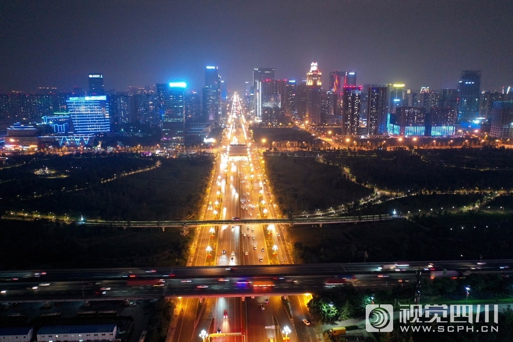 10月8日晚,国庆假期结束,记者在成都绕城高速、天府大道、娇子立交、川藏立交、三环路等地俯瞰交通情况,只见一排排车辆开着车灯井然有序返程,流动的车辆犹如一条“火龙”穿梭在道路上,驶向灯火通明的都市。