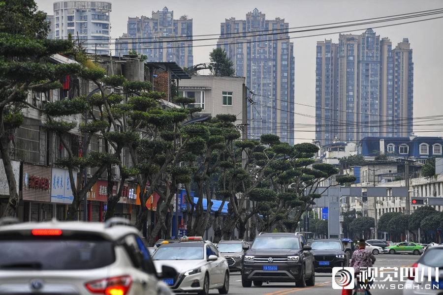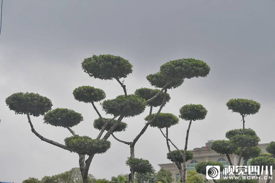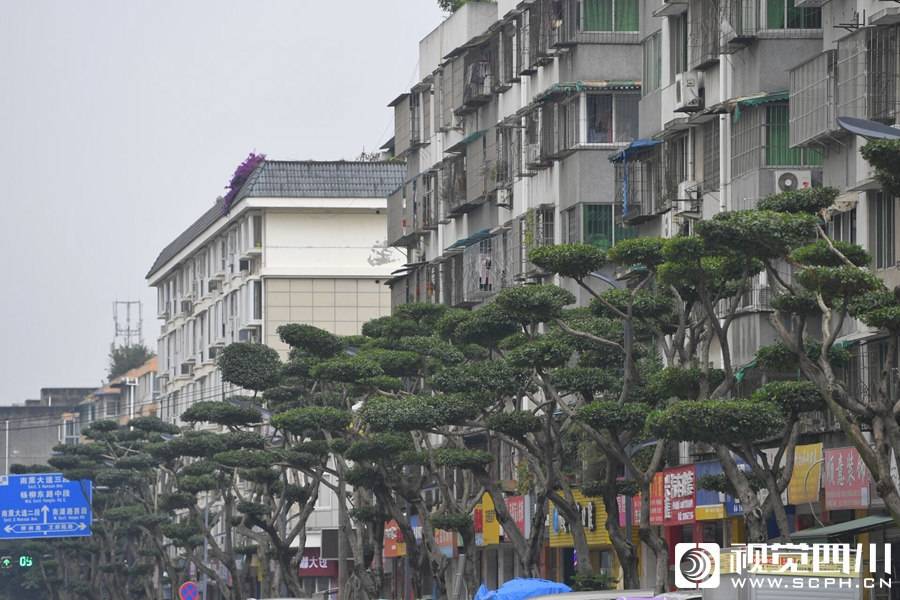 10月9日,记者在成都市温江区两河路发现,路边的小叶榕齐刷刷地换了“发型”,树枝上修出了一个个绿盘,远看颇有“川派盆景”的味道。