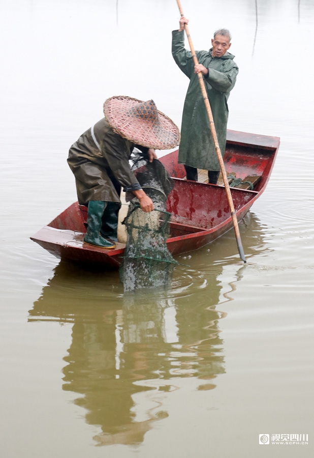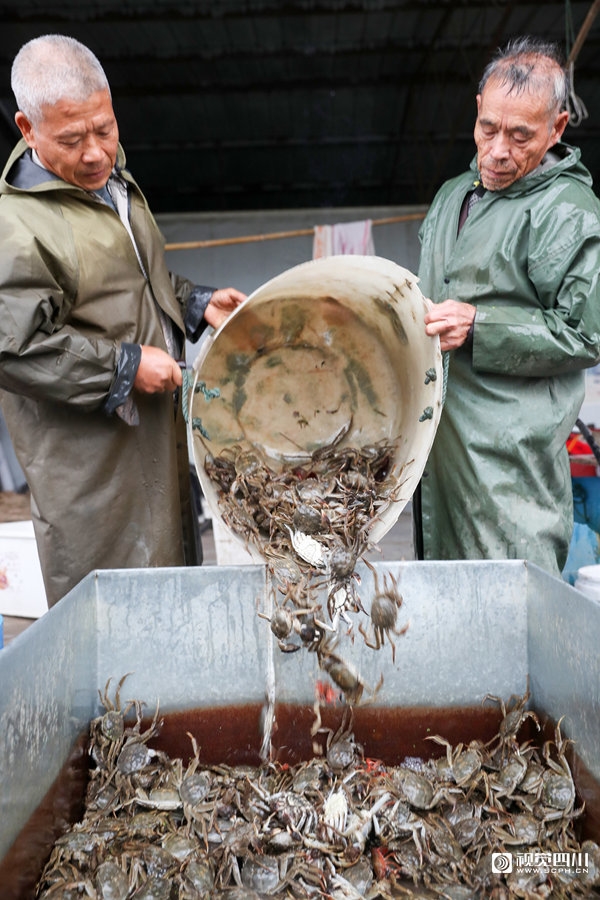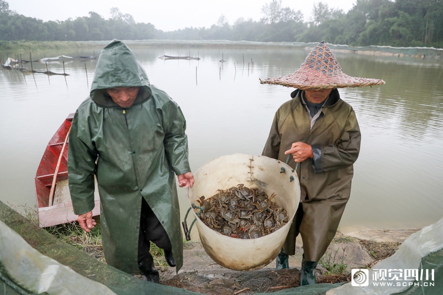 寒露时节,四川省广安华蓥市阳和镇鸽笼山村的特色扶贫产业黄金白大闸蟹进入捕捉期。