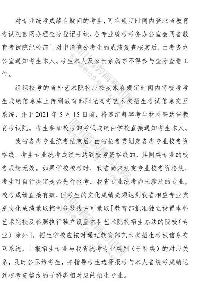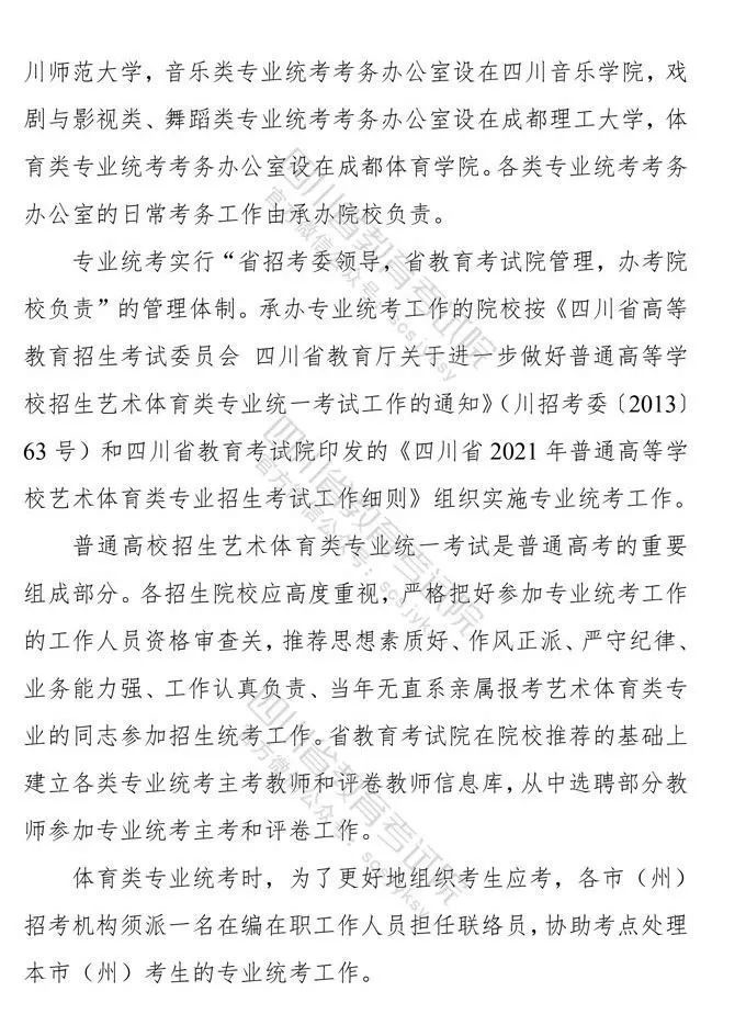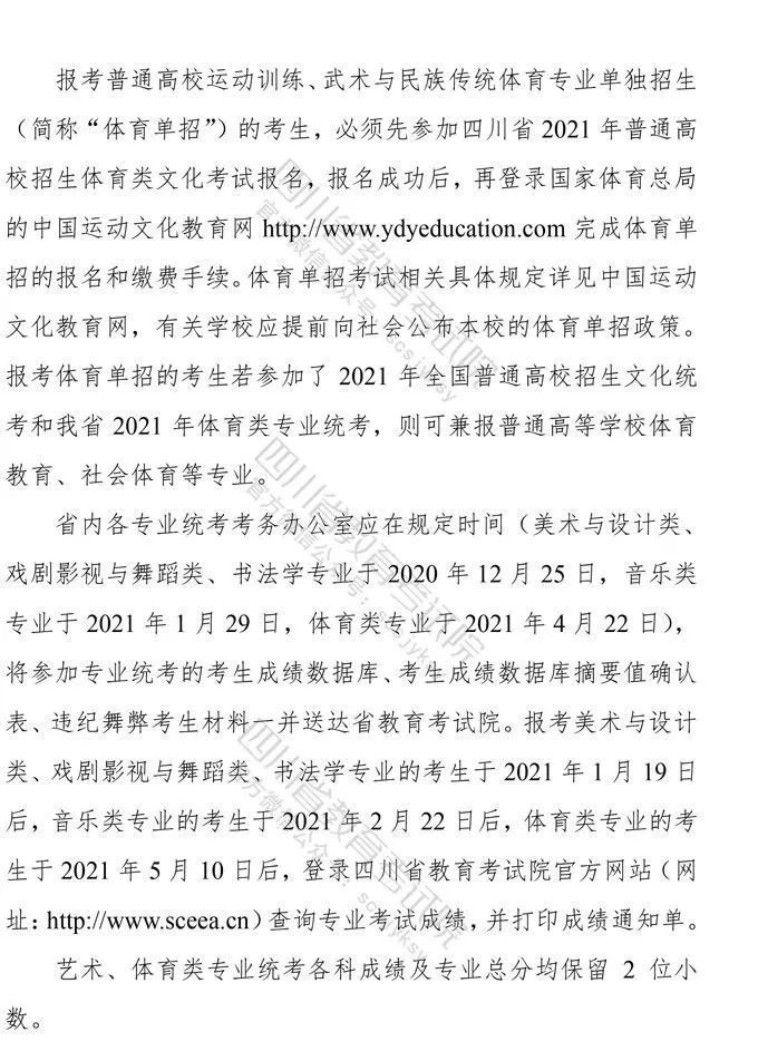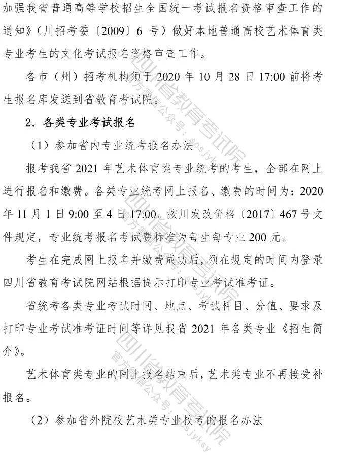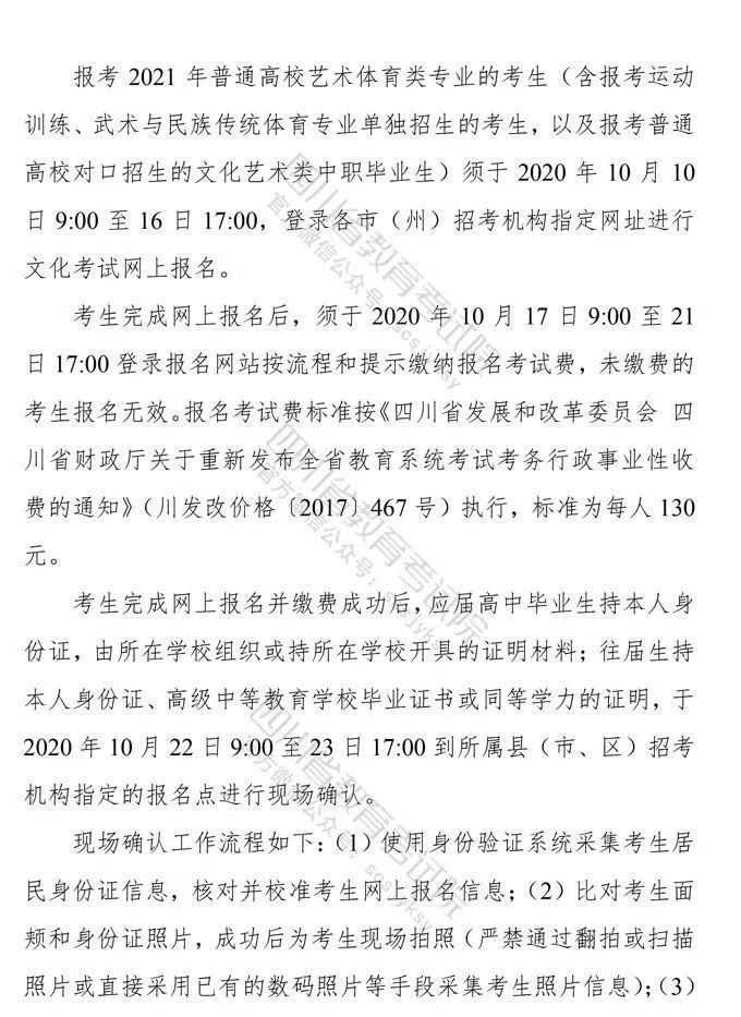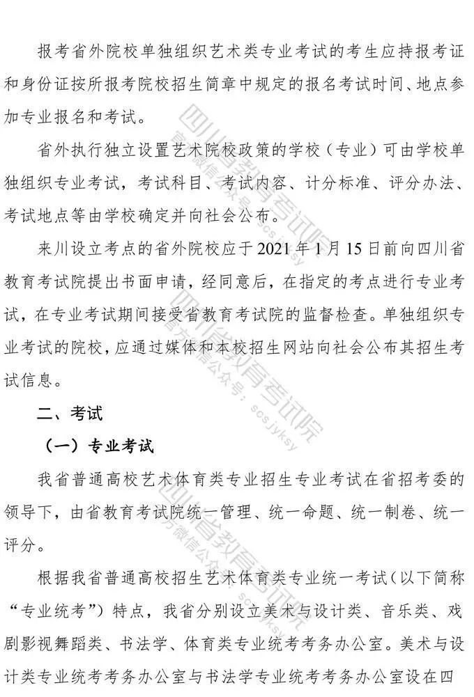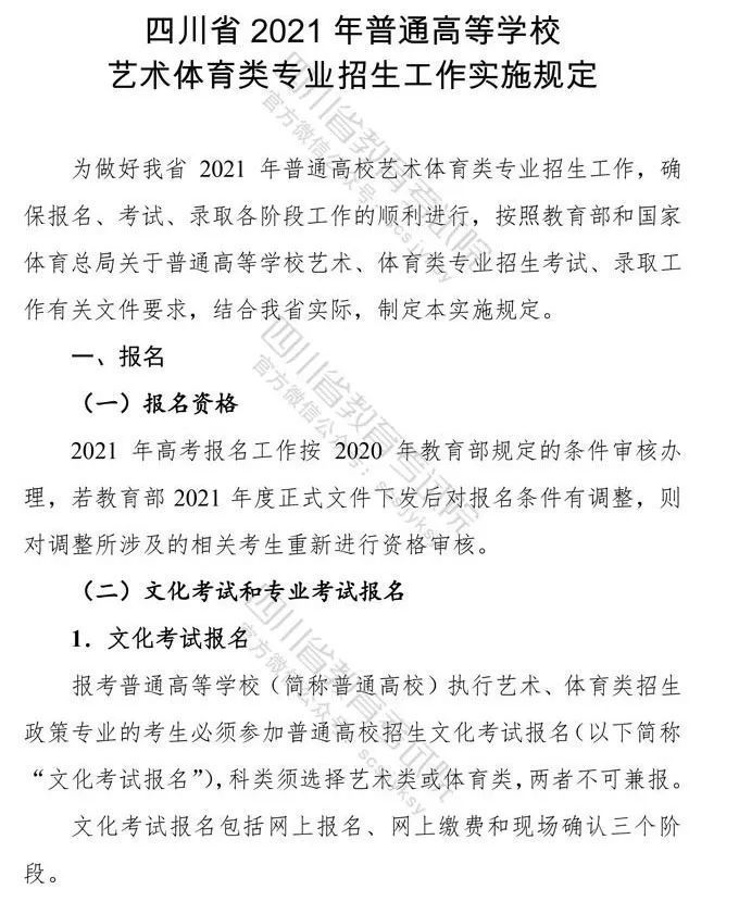 10月9日,记者从省教育考试院获悉,《四川省高等教育招生考试委员会关于印发<四川省2021年普通高等学校艺术体育类专业招生工作实施规定>的通知》已下发,《通知》对我省2021年普通高校艺术体育类各专业招生工作进行了统一安排部署,10月10日9:00至16日17:00为文化考试网上报名时间,各类专业统考网上报名、缴费时间为:11月1日9:00至4日17:00。