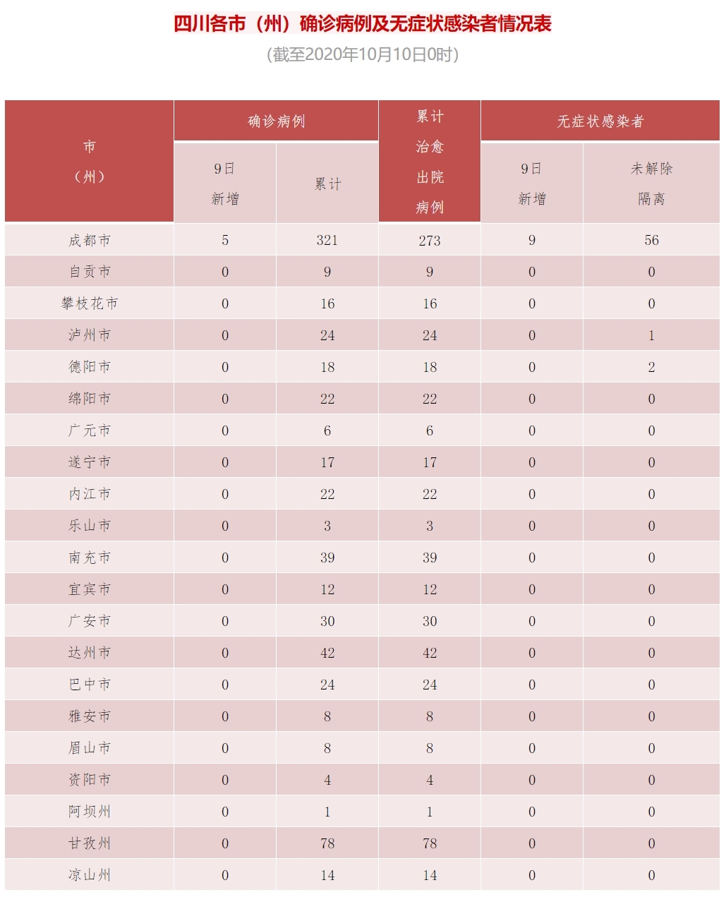 四川在线消息(记者石小宏)10月10日记者从省卫健委获悉,10月9日0-24时,四川新增新型冠状病毒肺炎确诊病例5例(均为境外输入):