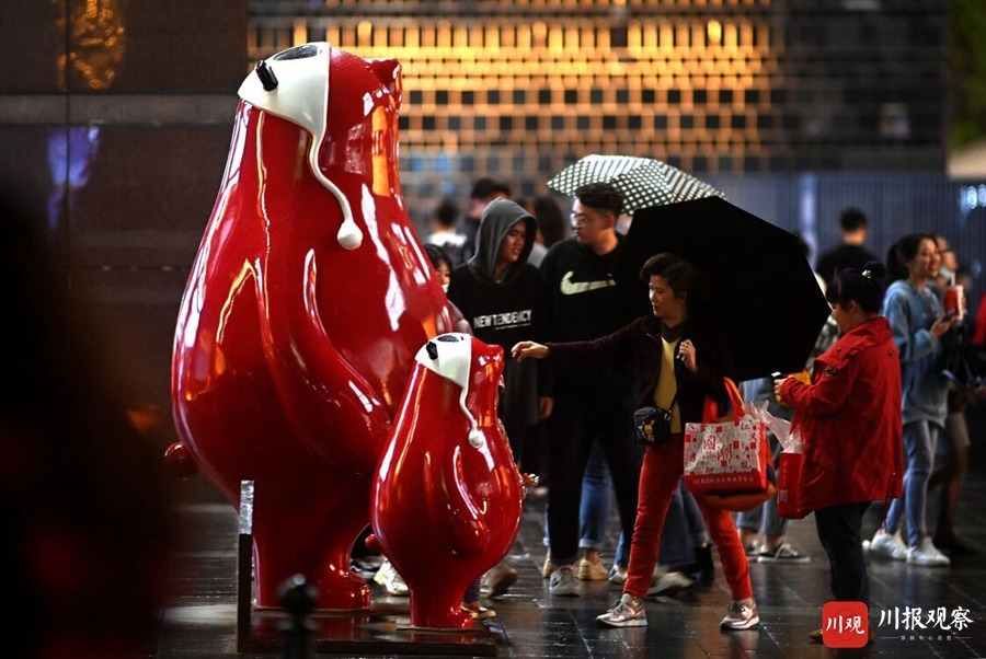 国庆黄金周期间,成都红星路步行广场上一大一小两只黑熊造型的艺术装置可谓出尽了风头。就在IFS“爬楼”大熊猫对面,这对变身通体红色、头戴大熊猫头套的黑熊,在万千人群中视觉冲击怡然矗立,它们齐齐仰头看着正上方著名的“爬楼”大熊猫,憨态神情似乎在想“明明大家都是熊”,羡慕的姿态下,又有着对未来充满渴望的积极形象。