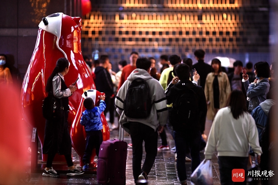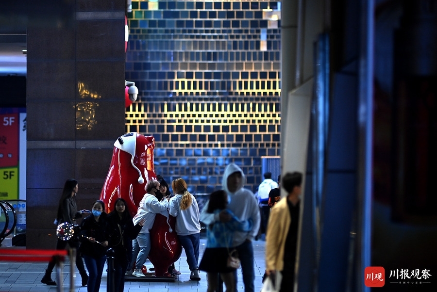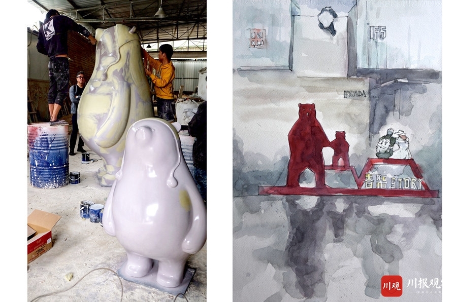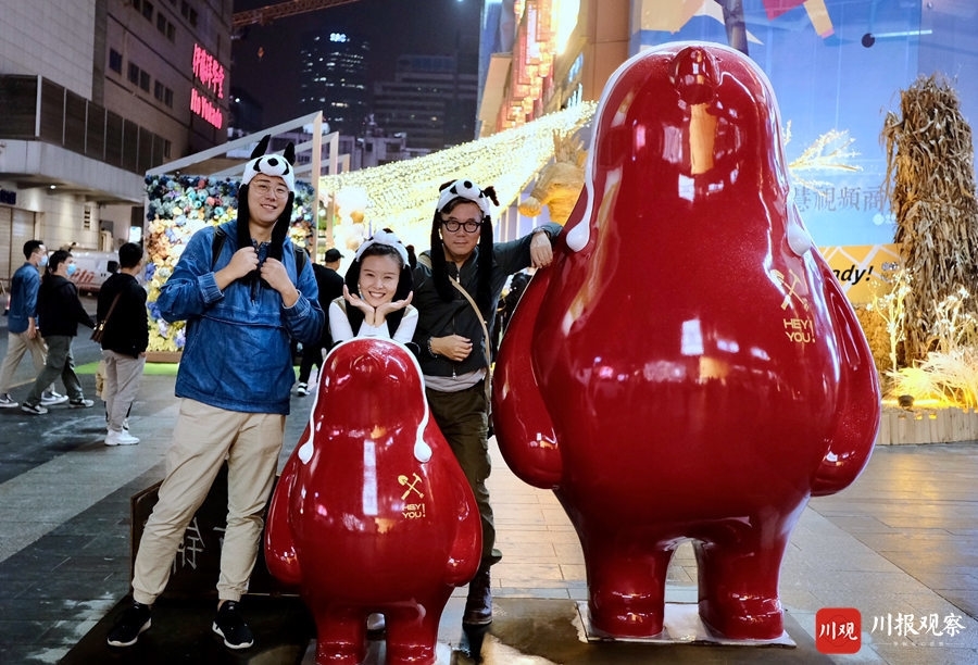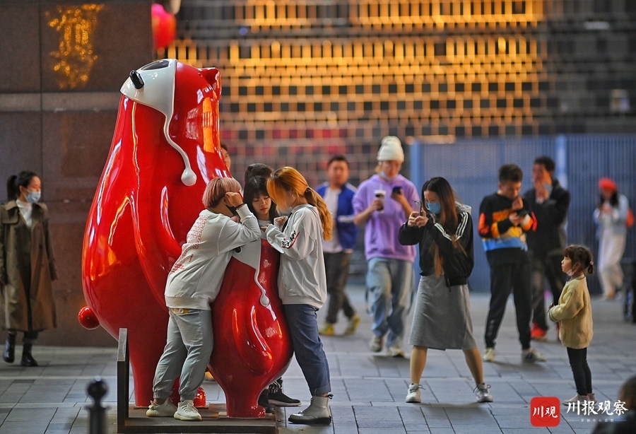 记者通过了解,这对设计感十足的艺术装置是成都本土青年设计师的作品。王孝明是设计团队成员之一,“从定稿IP到确认实施完工也就24天”。他说,“这样的艺术装置要经过泥塑、翻模、拼装、打磨、上漆和到现场的安放,一个环节都马虎不得。以‘咋子熊’来命名,也是取用四川方言,一种懵懂好奇、随遇豁达的生活心态。”作品在节日期间能受到这么多的追捧也让他们始料未及,王孝明说能为“春台市集”添彩,再艰辛的过程都值得了。