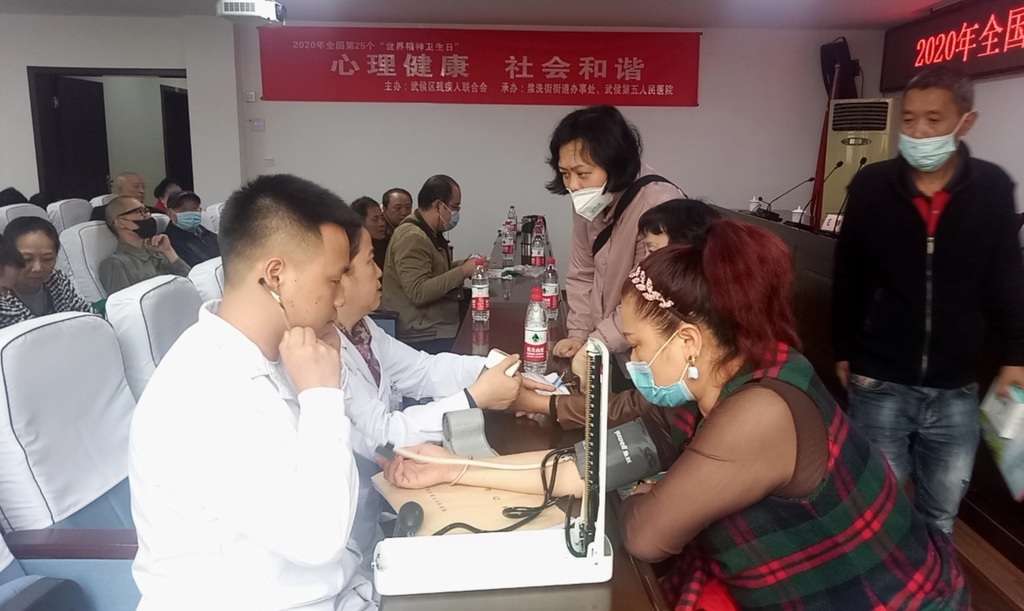 10月10日是“世界精神卫生日”,武侯区残疾人联合会联合浆洗街街道办事处、武侯区第五人民医院,在浆洗街街道开展“心理健康·社会和谐”主题活动,向社会和特殊群体家属宣传相关政策、社区工作模式、医院服务内容。