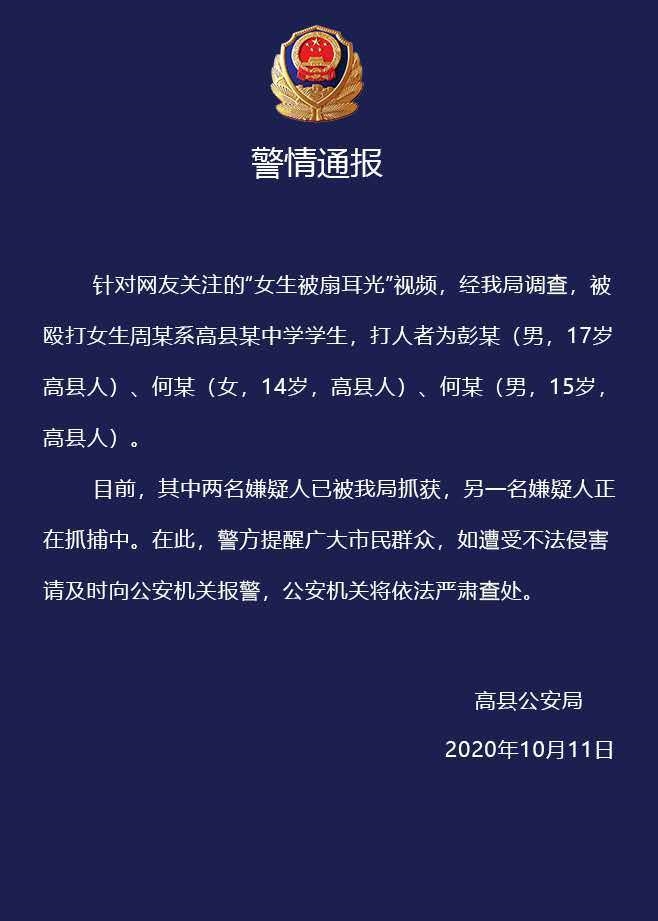 10月11日晚,宜宾市高县公安局发布警情通报称,针对网友关注的”女生被扇耳光"视频,经该局调查,被殴打女生周某系高县某中学学生,打人者为彭某(男,17岁高县人)、何某(女,14岁,高县人)、何某(男,15岁,高县人)。目前,其中两名嫌疑人已被高县公安局抓获,另一名嫌疑人正在抓捕中。在此,警方提醒广大市民群众,如遭受不法侵害请及时向公安机关报警,公安机关将依法严肃查处。