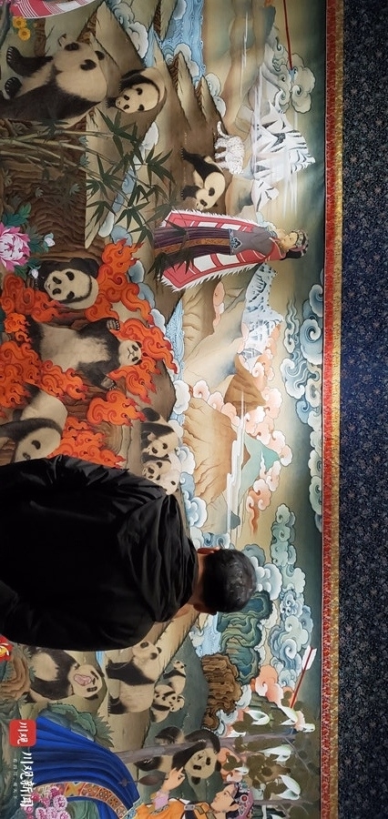 40多名阿坝唐卡绘画大师历时一年创作的唐卡巨制《大熊猫百图唐卡长卷》近日在四川省图书馆亮相。该长卷以大熊猫在阿坝繁衍生息为主题,总长172米、高2.6米,画心长142米、高1.6米,是迄今为止中国乃至世界以熊猫主题绘制的规模最大、长度最长、内容最丰富的唐卡巨作。