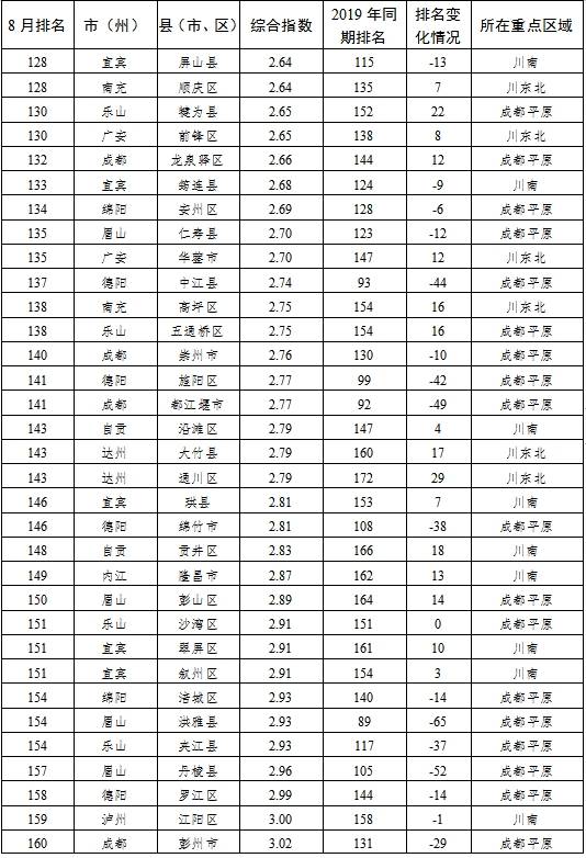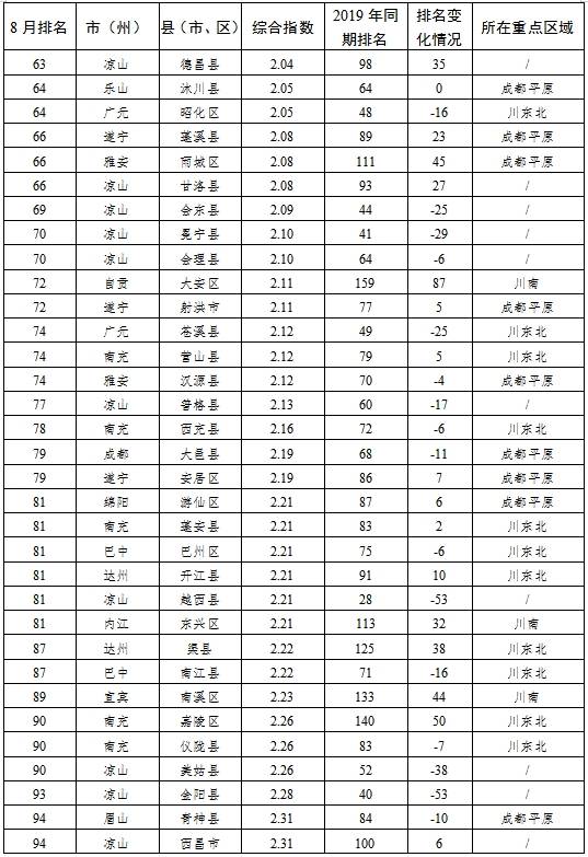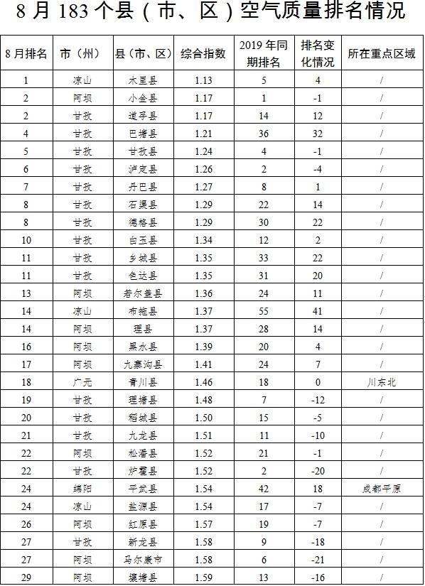 10月12日,记者从四川省生态环境厅获悉,2020年8月四川省183个县(市、区)城市环境空气质量排名结果出炉,在这份“榜单”中,哪些县(市、区)空气质量排名前十位?哪些排在后十位?一起来关注吧!