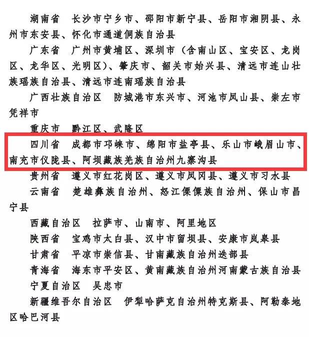 近日,生态环境部公布第四批国家生态文明建设示范市县命名名单(87个),四川共有5个县(市、区)入围,分别是成都市邛崃市、绵阳市盐亭县、乐山市峨眉山市、南充市仪陇县、阿坝藏族羌族自治州九寨沟县。