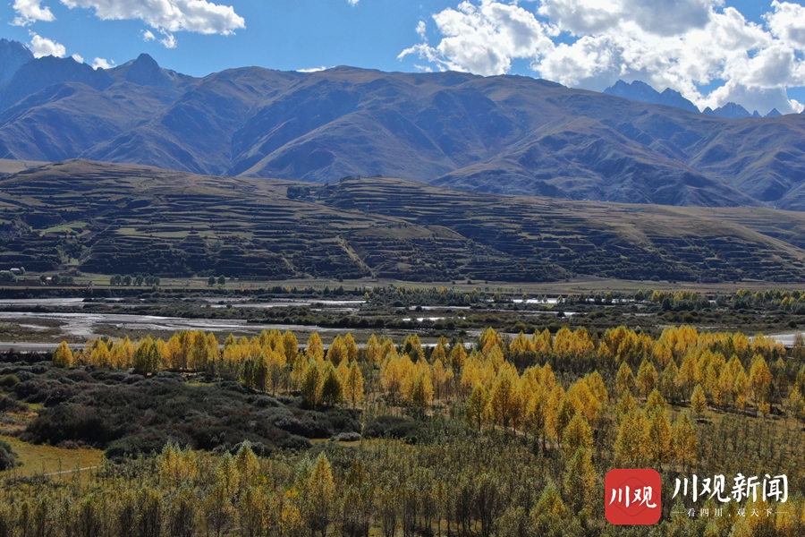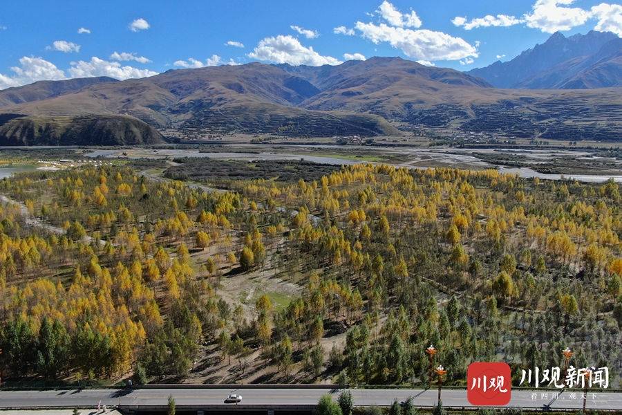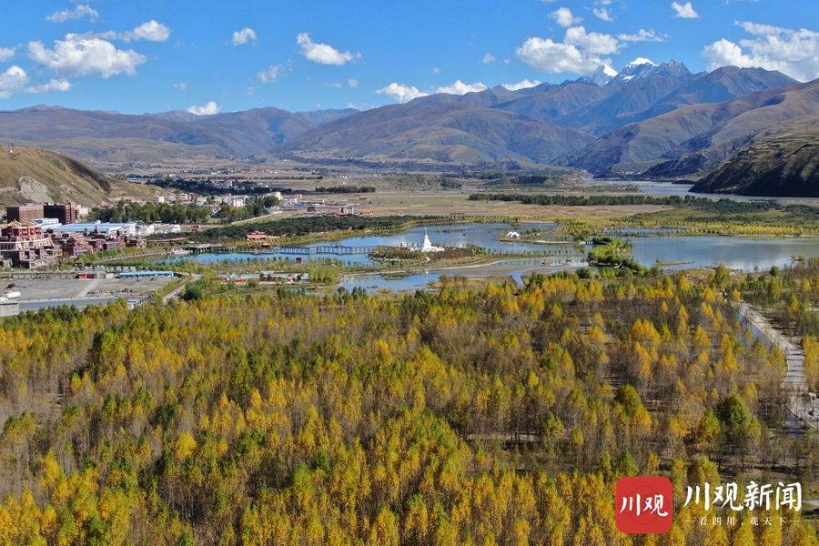 10月12日,甘孜县秋色正盛,雅砻湿地公园的杨树、柳树叶子变得金黄,与远处的蓝天白云相得益彰,好一派高原秋色图。