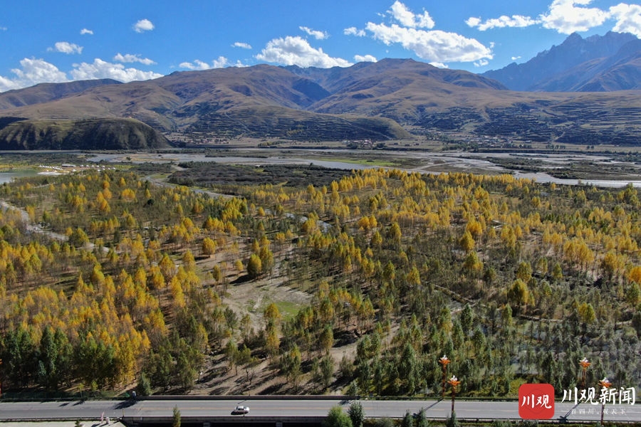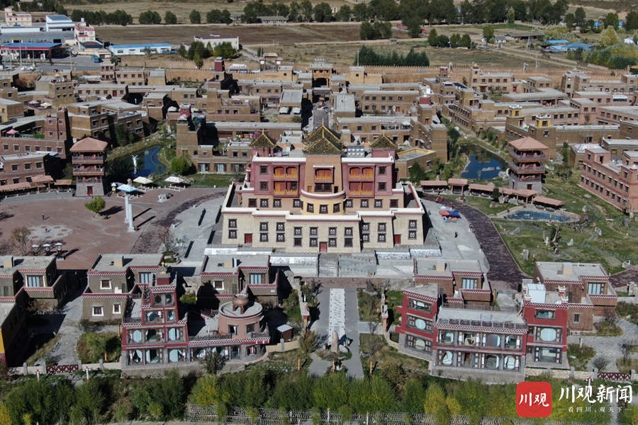 10月12日,记者俯瞰甘孜州甘孜县新地标——格萨尔王城。格萨尔王城位于甘孜县城东南部,建于格萨尔史诗“霍岭大战”遗址之上,主要由格萨尔文化区、湿地休闲区、草原体验区、史诗观光区构成。
