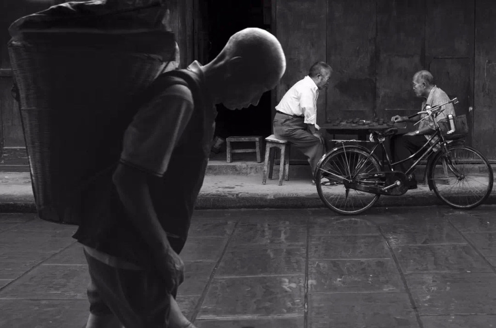 《阆中古城·老人与门》这组作品,黑白影像聚焦古城中的市井生活,老街上、房门边,老人或三三两两围坐着下棋,或在亲人的环绕中……影像无声,却讲述着平凡人家的温情故事。