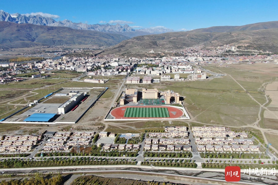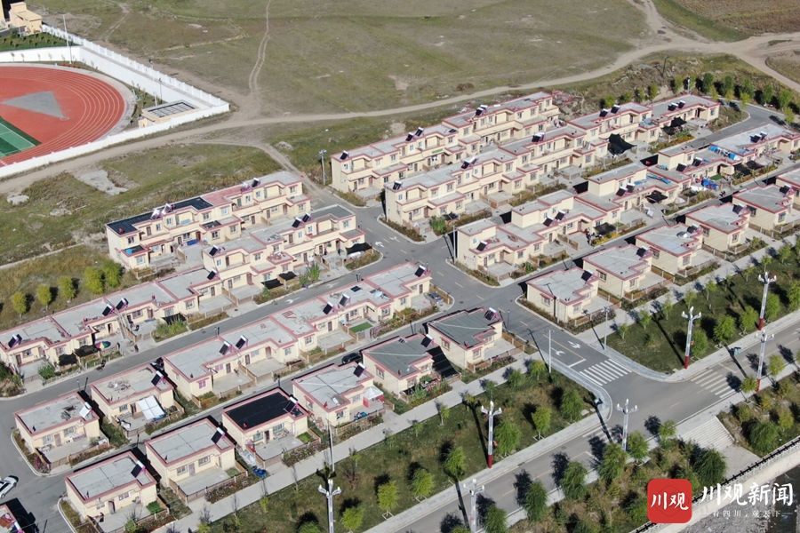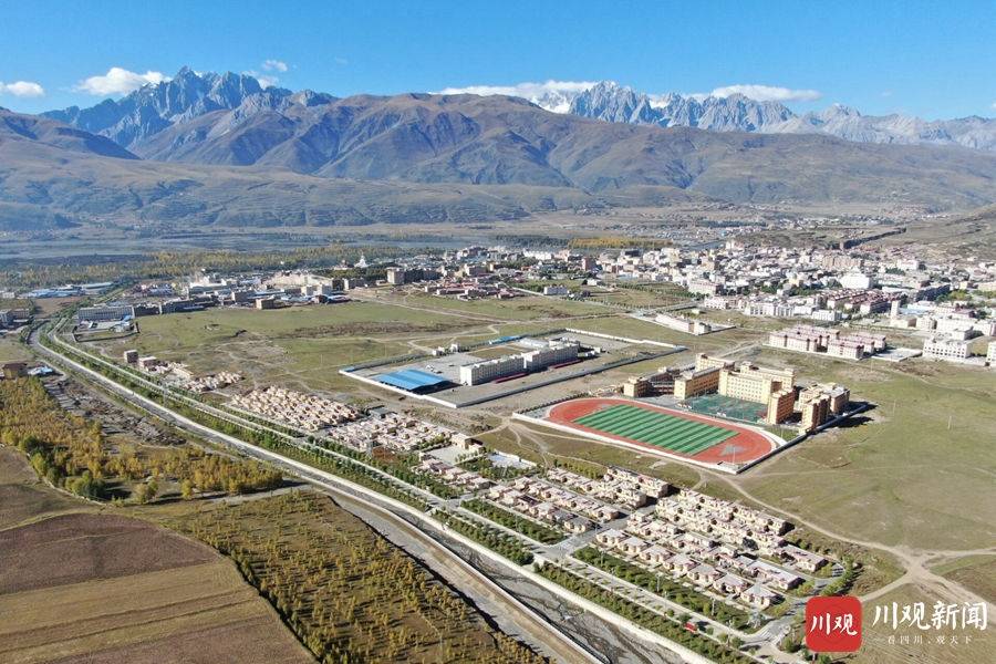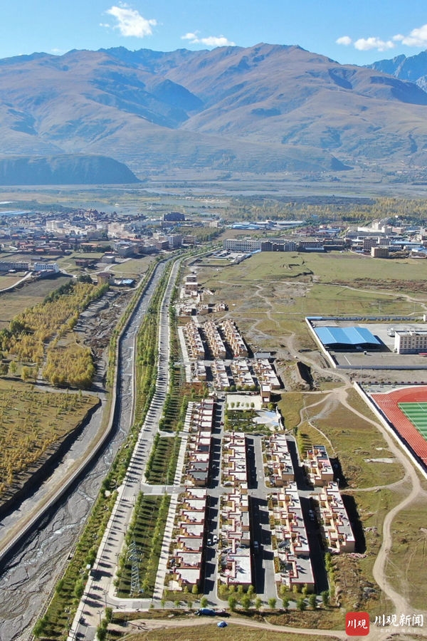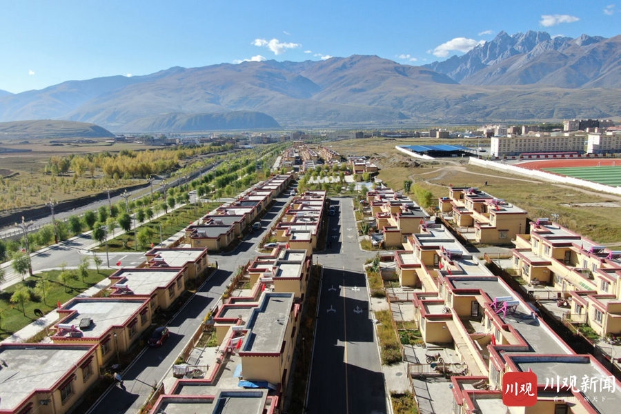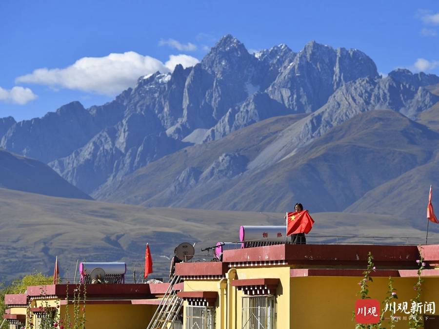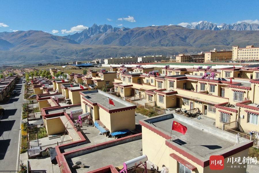 10月12日,俯瞰甘孜县吉绒隆沟集中安置点,一幢幢公寓式房屋错落有致,一条条宽阔的马路干净整洁,一面面五星红旗迎风飘扬。远处山色青翠,天空湛蓝,白云舒卷,阳光下的藏村美不胜收。
