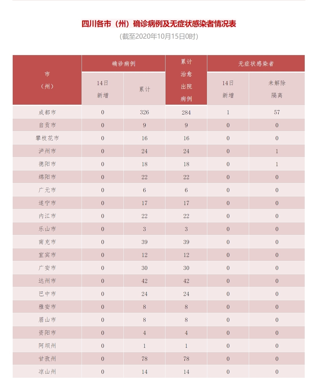 10月15日记者从省卫健委获悉,10月14日0-24时,四川无新增新型冠状病毒肺炎确诊病例,无新增治愈出院病例,无新增疑似病例,无新增死亡病例。