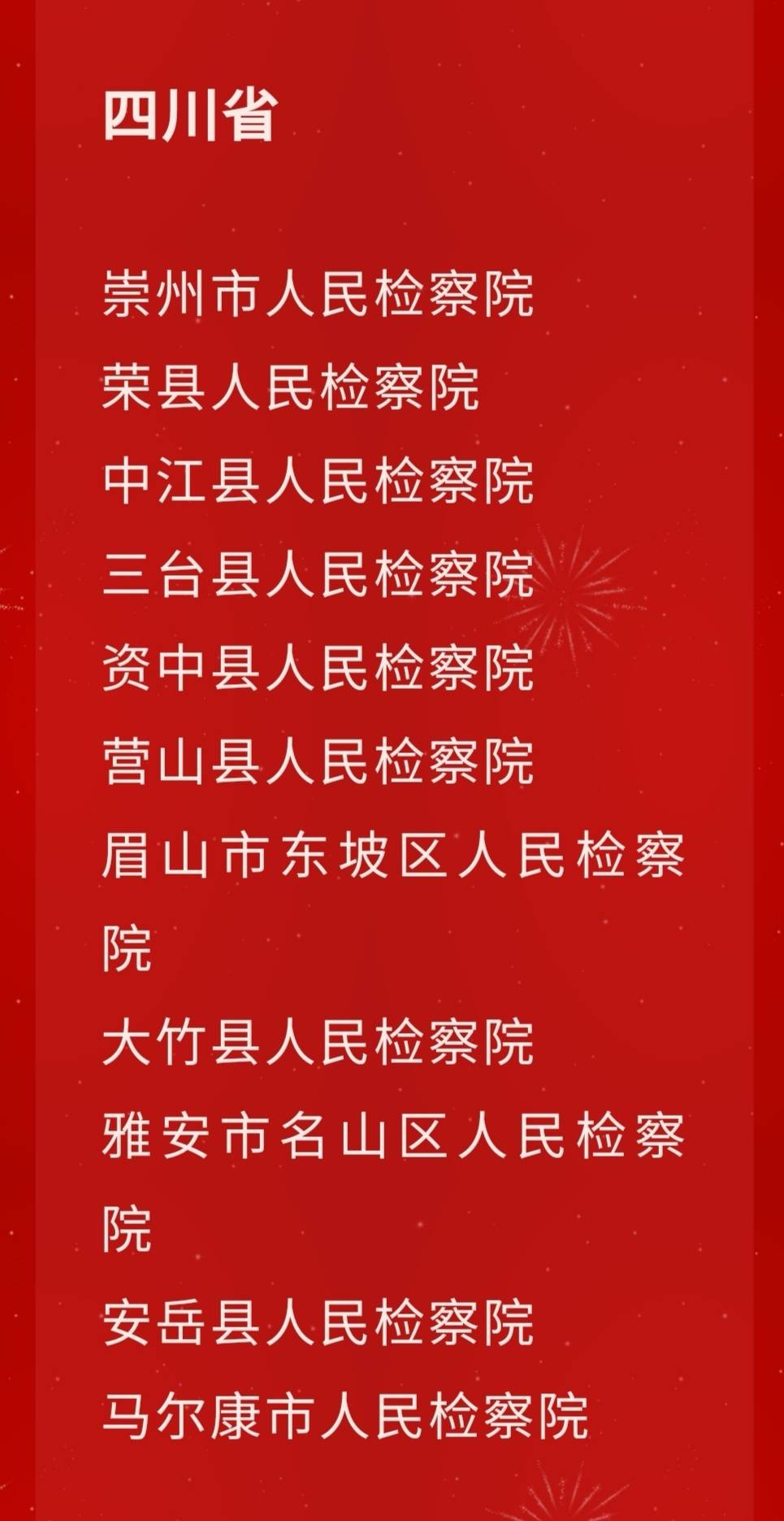 崇州市人民检察院、荣县人民检察院、中江县人民检察院、三台县人民检察院、资中县人民检察院、营山县人民检察院、眉山市东坡区人民检察院、大竹县人民检察院、雅安市名山区人民检察院、安岳县人民检察院、马尔康市人民检察院。