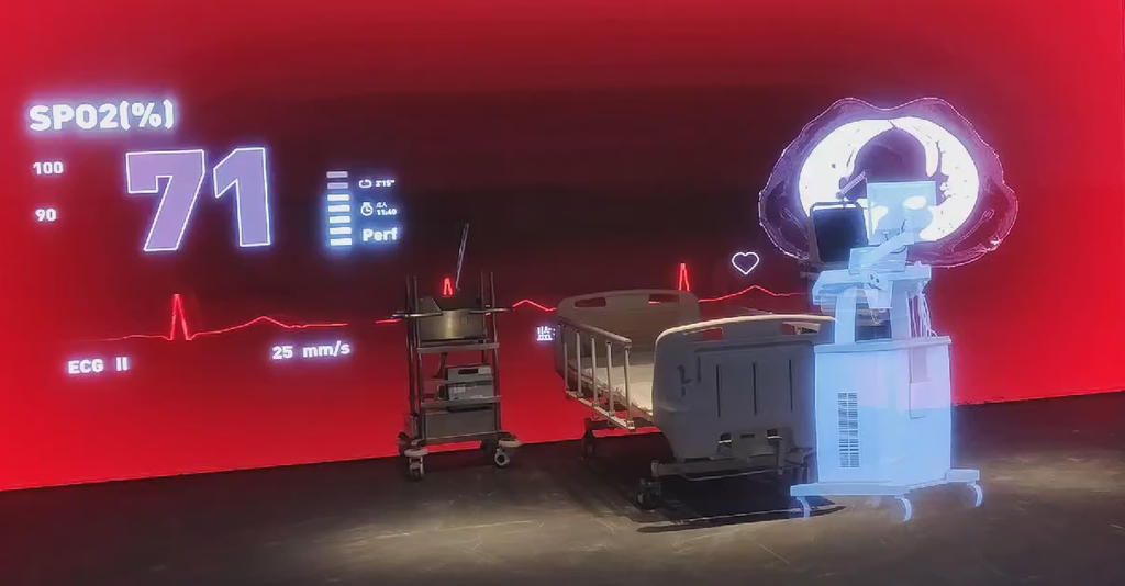 这个通过幻影复现的场景,再现了新冠肺炎治疗过程中,医生近距离对病人进行插管的情形。据现场讲解员介绍,进行插管操作时,医生与患者口鼻最近距离只有10厘米,患者的呼吸道分泌物会喷溅到医生的面罩上,传染风险极高。但插管流程加快一分钟,患者就多一份生的希望。这里是和死神搏斗的最后一道防线,而医务人员就是站在这道生死门前的守门员。