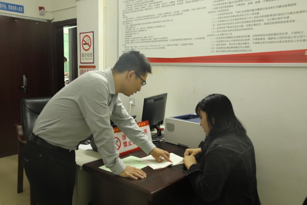 兴文县纪委监委信访室干部(左)向信访反映人宣传、解释相关条例规定。