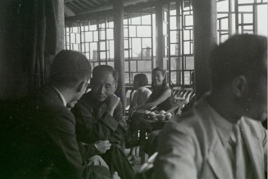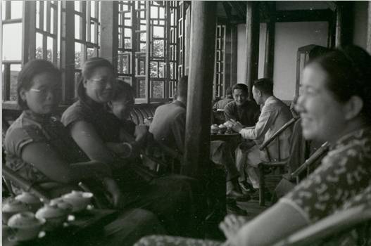 尽管曾有照片记录枕江楼的外部景观,但是其内部构造如何,一直只有文字描述。这一次,袁庭栋就获取了一组高清枕江楼内部照片。这组照片拍摄于1943年5月22日,一群文人雅客为李约瑟博士送行,身着长布衫和西装的人们围坐一团。不远处,是身着短袖旗袍的妇女。桌上放着盖碗茶,茶客摆着龙门阵,热闹程度不亚于今天的鹤鸣茶馆。这组照片中,还有一张特别的合影:四人并排而坐,从左到右依次为著名哲学家冯友兰、当时金陵大学文学院院长兼哲学系主任倪青原、华西协合大学文学院院长罗忠恕等,这些人皆为当时文化界的大咖,可见当时枕江楼的热门程度。