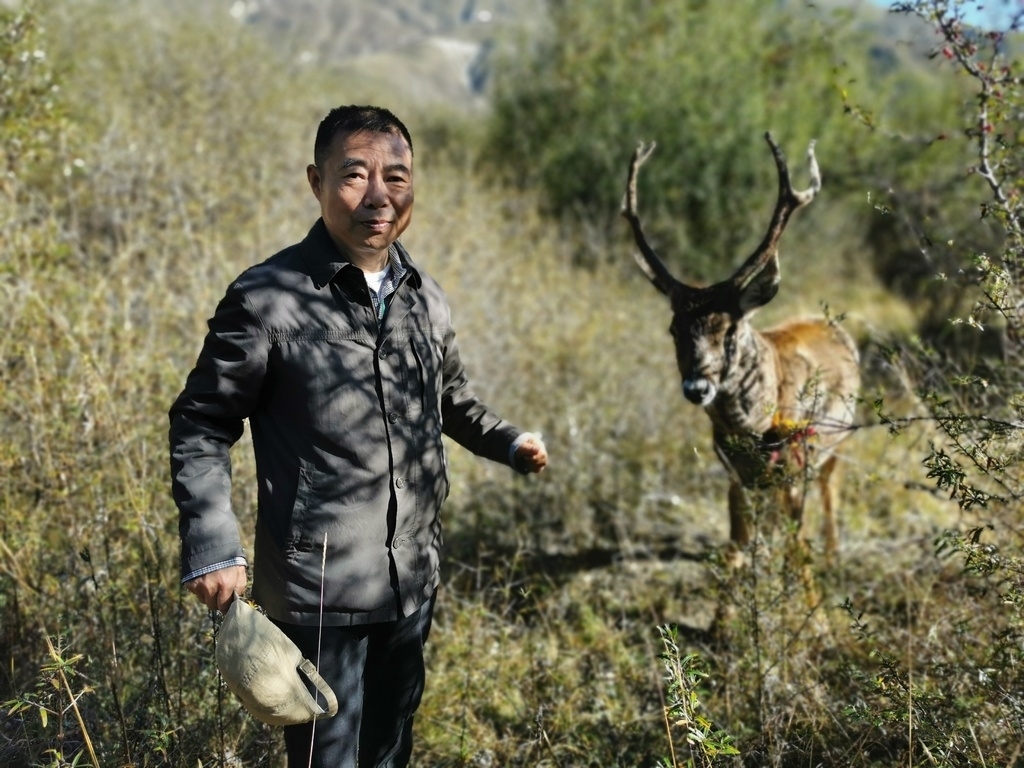 “它怕生,它是我的宠物”,刘伟笑着说,然后把手放在白唇鹿的背上,慢慢地抠痒痒,白唇鹿安静了下来。