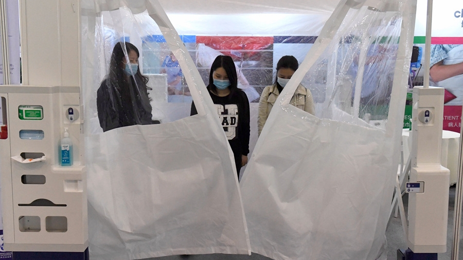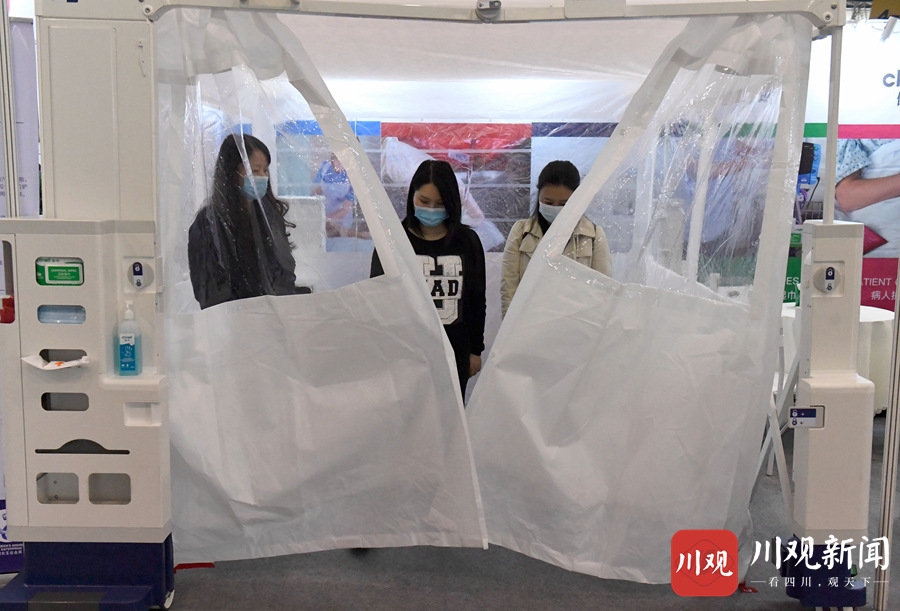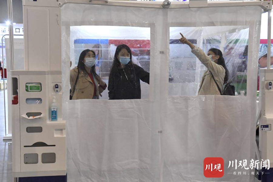 10月16日,在成都世纪城新国际会展中心4号馆,参展商在“首届四川国际医疗防疫物资博览会”上展出的快速简易病房特别引人注目,快速简易病房具有重量轻、移动方便、结实耐用、独立空间、高效空气过滤器等多种功能,一个人操作,5分钟即可建成一间隔离单间。