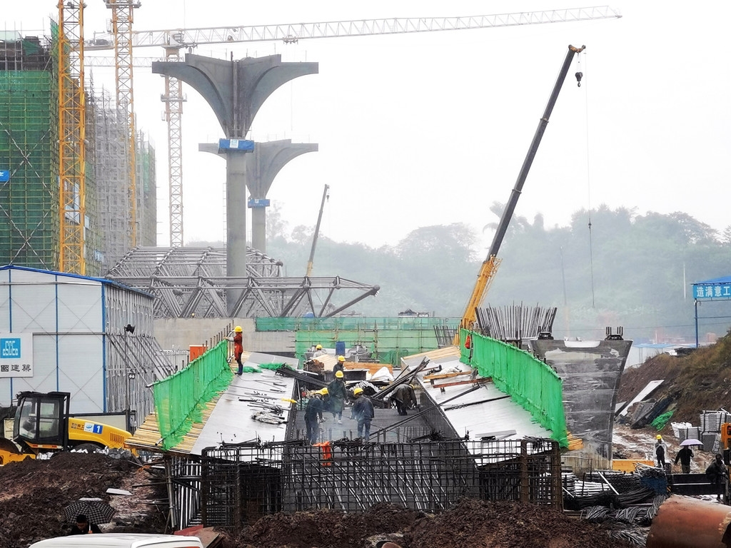 在泸州高铁站侧式站房的两根花瓣梁“油纸伞”前,周边配套市政道路工程中的D匝道上,工人们正在支模、绑扎钢筋。(郭荞璐 摄)