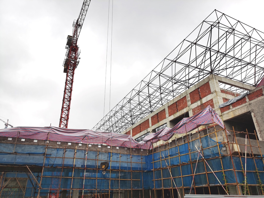 在泸州市医教园区基础设施EPC+PPP项目的施工现场,体育馆屋面钢网架结构正在紧张施工中。焊接作业区被设置在主体完工的体育馆室内,三个工人正配合完成材料的切割作业。