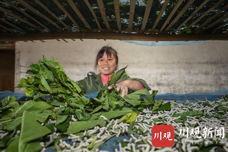 嘉乐镇人民村,村民周永莲在照料自家养的蚕。