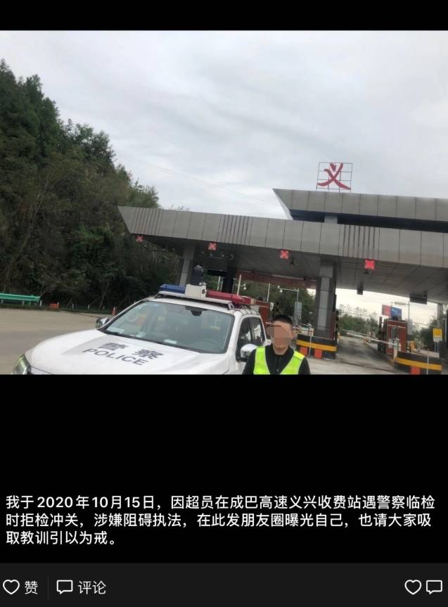 “我于2020年10月15日因超员在成巴高速义兴收费站遇警察临检时拒绝停车受检,涉嫌阻碍执法,在此发朋友圈曝光自己,也请大家吸取教训,让大家引以为戒。”