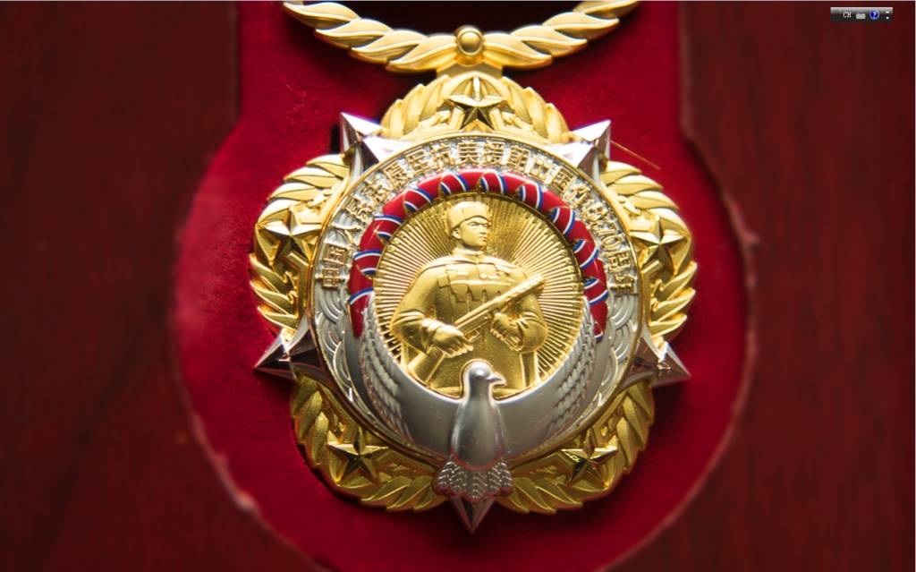 记者看到,“中国人民志愿军抗美援朝作战70周年”纪念章由一个红色木盒盛放,木盒内写有“中国人民志愿军抗美援朝作战七十周年”和“中共中央 国务院 中央军委”两行字。纪念章以团花和五角星为整体造型,金银两色为主色调。下方是一只展翅的和平鸽,中心是被和平鸽双翼围护着的志愿军战士形象,上方饰以有朝鲜民族特色的红蓝两色纹饰。纪念章整体尽显庄重与光荣,代表着中国人民始终没有忘记老一辈无产阶级革命家和中国人民志愿军建立的不朽历史功勋。