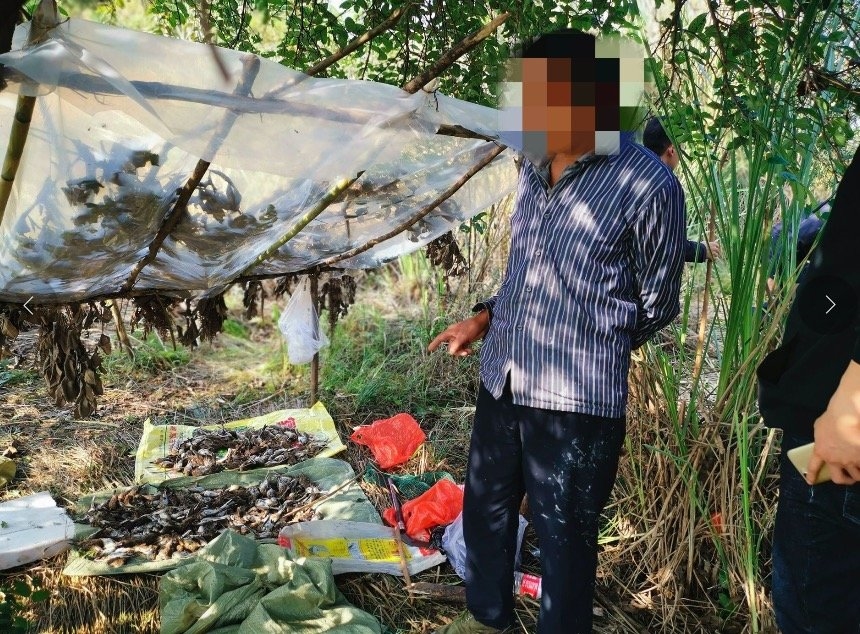 民警到场后发现现场架设的捕鸟网犹如一个八卦阵,以环形模式由内到外架设捕鸟网数层。民警在中心现场只能边走边剪才能在山坡上正常行走。在密织如麻的捕鸟网下,堆放有大量被捕获的鸟类,另有捕鸟网50余张和2台播放着模拟鸟叫的诱捕器。