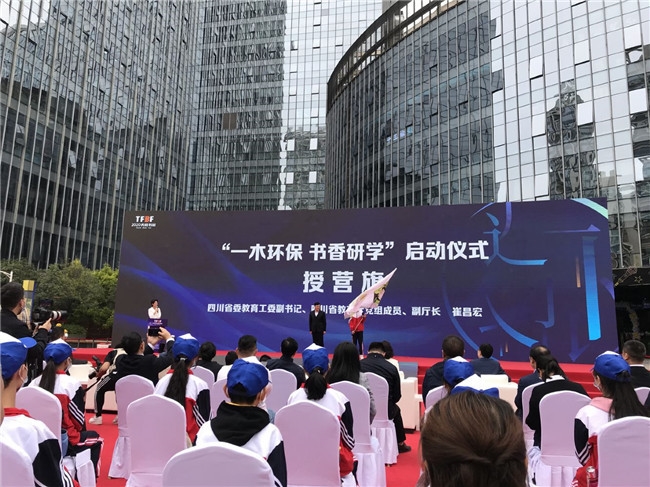 启动仪式最后,四川省委教育工委副书记、四川省教育厅党组成员、副厅长崔昌宏为来自成都市武侯区参与“一木环保 书香研学”主题活动的同学们授旗。仪式结束后,他们将作为此次万人研学的首发团,开启为期三天的研学之旅。