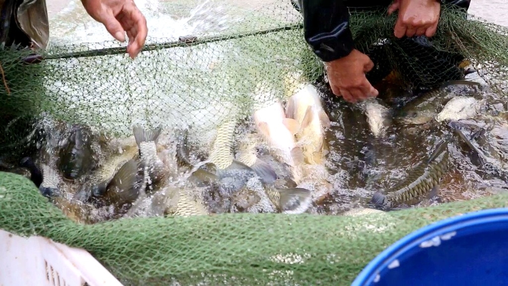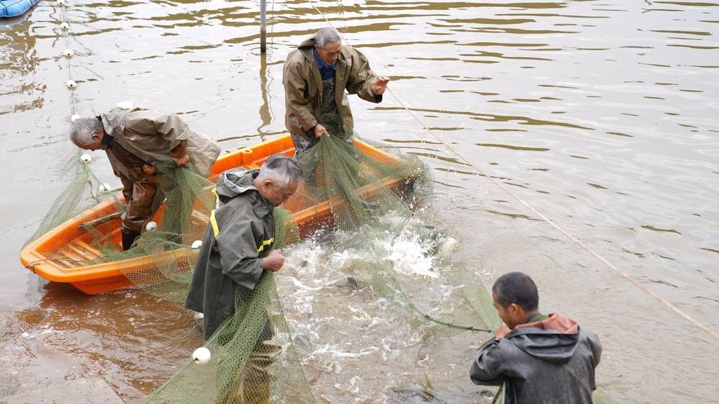 “快看,快看,抬网起来了。”“这鱼真大,这一网就有500多公斤鱼啊。”10月16日一大早,望水寺村的生态鱼塘旁,村民余汝刚操纵着抬网装置,数百条鲫鱼、鲤鱼、鲢鱼、草鱼被收入网中。