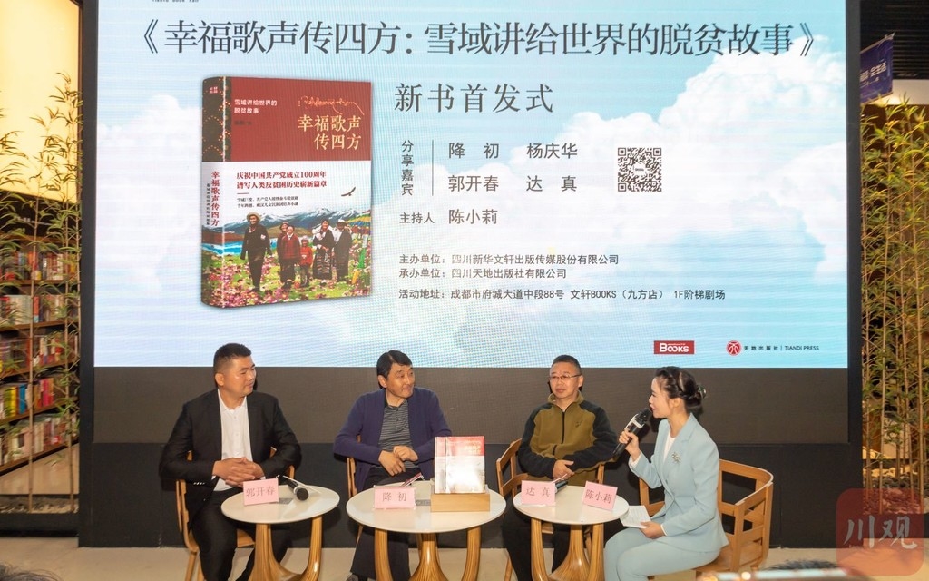 第七个国家扶贫日的第二天,10月18日上午,藏族作家达真携反映甘孜藏族自治州脱贫成果的长篇报告文学《幸福歌声传四方:雪域讲给世界的脱贫故事》亮相天府书展,在文轩Books(九方店)举办新书首发式。
