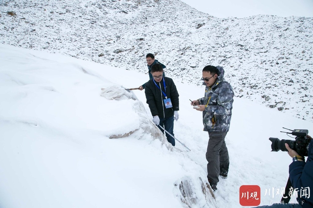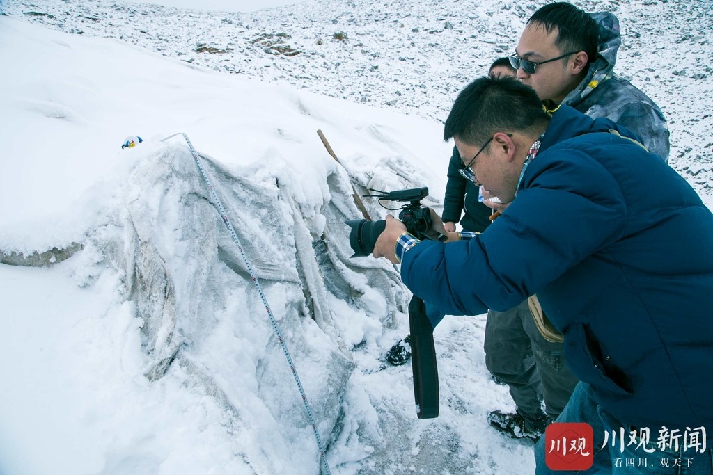 今年8月5日,该研究团队利用给冰川“盖被子”的手段,在达古冰川海拔约5000米的冰川消融区,建立了500平方米区域的试验区。本次现场考察发现,经过两个月时间,“盖被子”区域的冰体消融速度明显减少,与未覆盖区域的冰体相比,能够减缓冰川消融厚度达到1米,初步估计能够减缓70%左右的冰川消融。