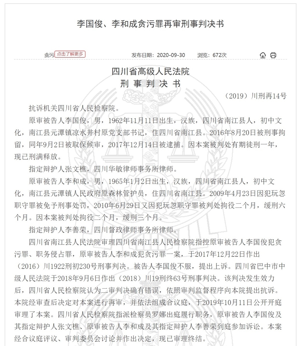 10月18日,记者从中国裁判文书网获悉,近日,巴中南江县元潭镇凉水井村原党支部书记李国俊伙同南江县元潭镇人民政府原森林管护员李和成利用协助政府从事林地征收的职务便利,共同侵占国家资金79593.70元;李国俊将集体财产164220元非法占为己有一案做出终审判决: