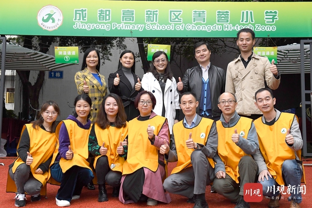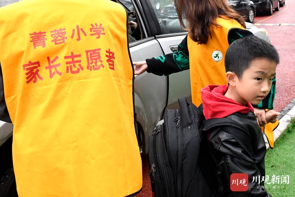 10月19日,成都高新区菁蓉小学校门口6名家长志愿者面带微笑迎接来上学的小学生,这样的画面已在校门口成为常态。今年5月份以来,穿着“黄马甲”的“家长志愿者”成了成都高新区菁蓉小学校门口一道亮丽的风景线!