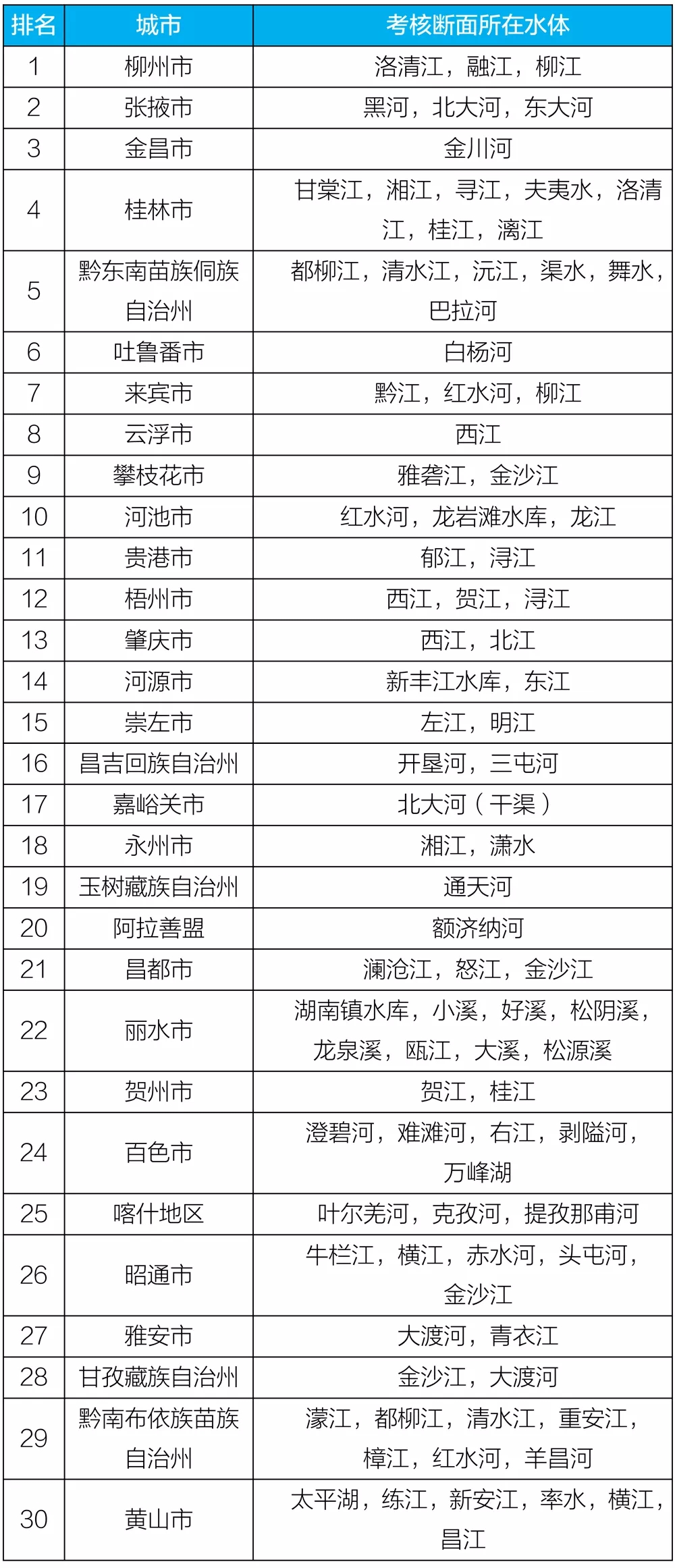通报显示,2020年1-9月,全国地级及以上城市中,柳州、张掖和金昌市等30个城市国家地表水考核断面水环境质量相对较好(从第1名至第30名),铜川、沧州和邢台市等30个城市国家地表水考核断面水环境质量相对较差(从倒数第1名至倒数第30名)。