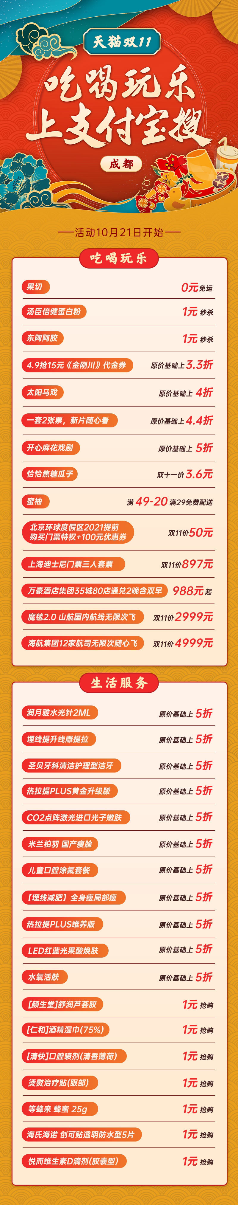 今年天猫双11,饿了么(含口碑)、淘票票、飞猪等阿里经济体的成都商家,将拿出超低优惠、爆款好物,提供双11爆款服务,包括9.9的廖记棒棒鸡,12元的一只酸奶牛,100元就能抢小龙坎200元的通用券等。