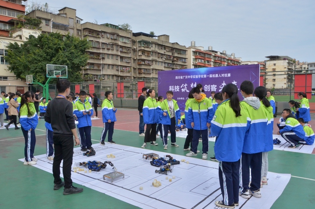 签约仪式结束后,广汉中学实验学校第一届机器人对抗赛拉开帷幕。这是电子科技大学K12项目组为该校入选“创新人才计划”的学生量身打造的比赛,目的是让学生们在机器人实战比赛中,激发自己的科技兴趣,培养动手能力。参赛的机器人由电子科技大学的老师们提前完成编程和组装,为可以直接操作的对抗机器人。