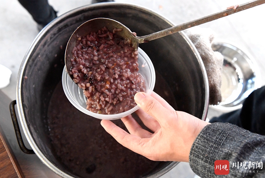 志愿者为老人送上煮好的八宝粥。